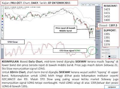 Untuk 60min Chart, short-term trend dijangka SIDEWAY kerana wujud sedikit ‘lopong’ di upper band. Kebarangkalian untuk LONG lebih tinggi dilihat pada kebanyakan indikator seperti GZC,MACD dan RSI. Malah STO Slow yang paling sesuai ketika market Sideway juga menunjukkan signal LONG tetapi overbought. Hold LONG selagi di atas 1395,keluar dari posisi LONG di bawah 1395.